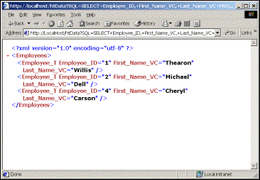 http://localhost/htData?SQL=SELECT+Employee_ID,+First_Name_VC,+Last_Name_VC+FROM+Employee_T+FOR+XML+AUTO